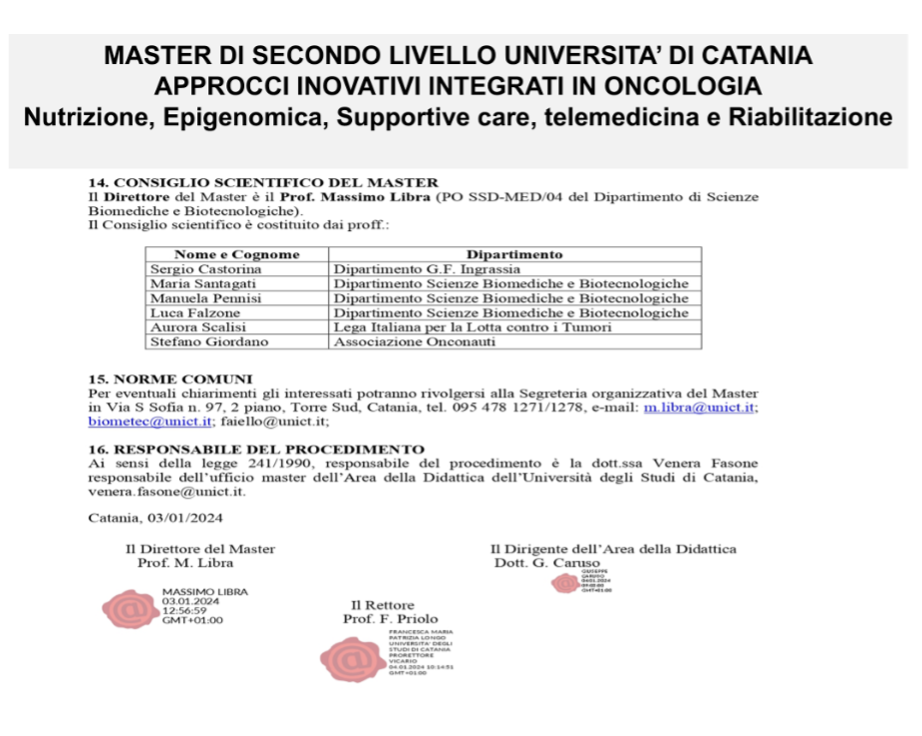 Nel 2023, presso l’Università di Catania, è stato attivato un master di secondo livello, ispirato all’esperienza dell’associazione Onconauti, sulle terapie integrate oncologiche. Rivolto ai professionisti che possono essere interessati ai percorsi di riabilitazione oncologica.
